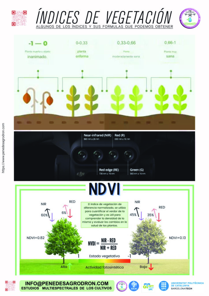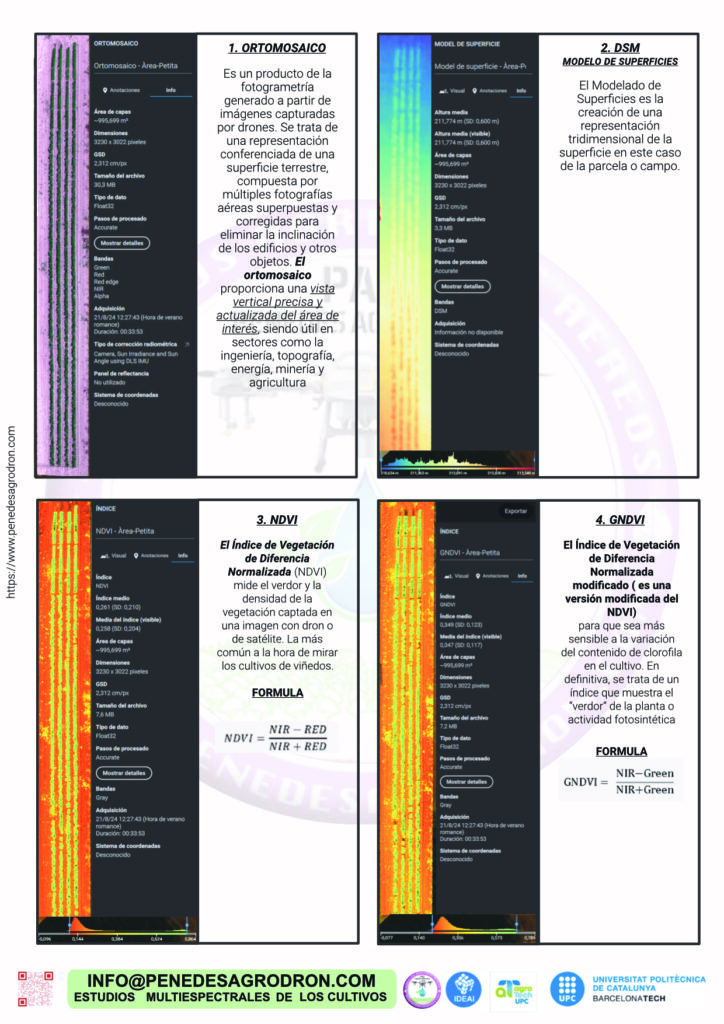 - Generación de mapas de índices vegetativos, como el Índice de Vegetación de Diferencia Normalizada (NDVI), para evaluar la densidad y salud de la vegetación. Índice (OSAVI) de las condiciones del suelo y buen indicador del contenido de clorofila de los cultivos en sus primeras etapas de crecimiento perfecto para el inicio de temporada. Índice (GNDVI) que calcula el contenido de la clorofila en lugar de la roja en el NDVI y se ha demostrado en investigaciones que es más estable que el índice NDVI, utilizado en cultivos con copas densas o en estados de desarrollo más avanzados. Índice (NDRE) de variación en la salud de los cultivos en etapas más avanzadas porqué utiliza luz con bordes rojos que puede penetrar las hojas mucho más profundamente que la luz roja (utilizada en NDVI). Dónde hay un dosel más intenso, es recomendable utilizar NDRE.